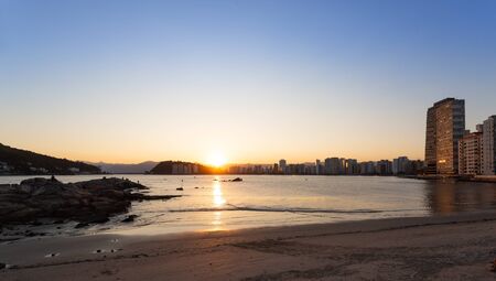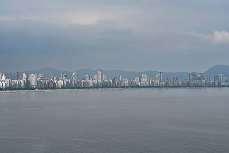Landscape view of the beaches of Santos and the city buildings in the background. SP, Brazil.