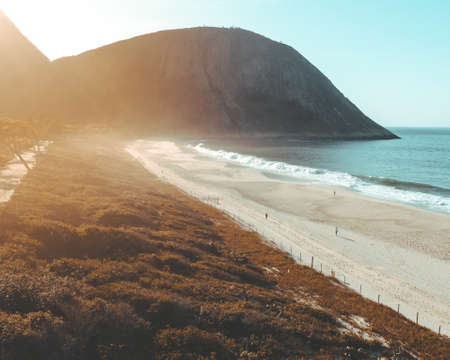 Aerial view of Barra da Tijuca beach during sunset, golden light. Rio de Janeiro, Brazil