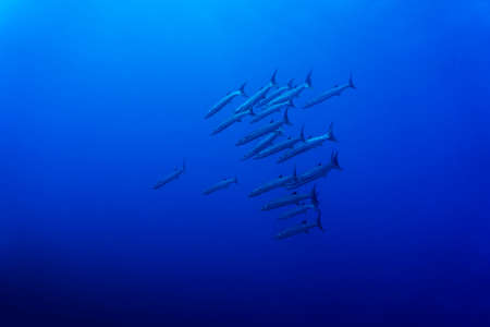 Underwater view of a school of barracuda swimming through clear blue ocean water