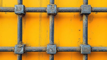 A detailed shot of a metal grid against a bright yellow background, showcasing textures and rusted features, ideal for industrial and architectural themes.