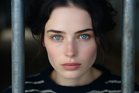 Female prisoner gazing into the camera from behind the jail cell bars in a prison setting