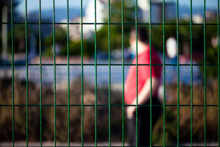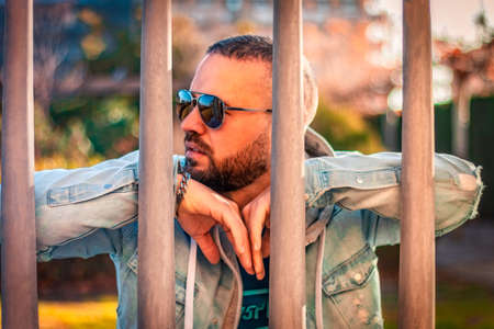 Play with me. Earnest determined guy staying behind fence and staring at camera