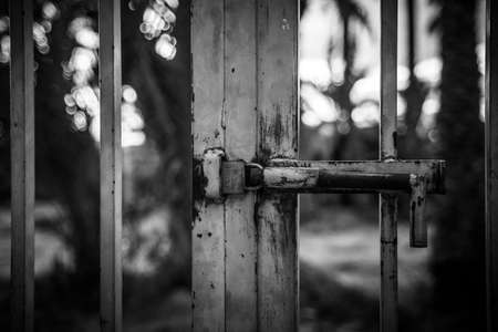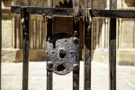 Gates with mesh on lock in iron fence. Metal gate with grid is fortified with diagonal reinforcement. Background image of steel rough gate with lock on chain.
