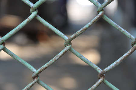 Close up Solid Metallic Wire Mesh Chain link Fence in Vintage Style Steel. Selective focus wire mesh fence