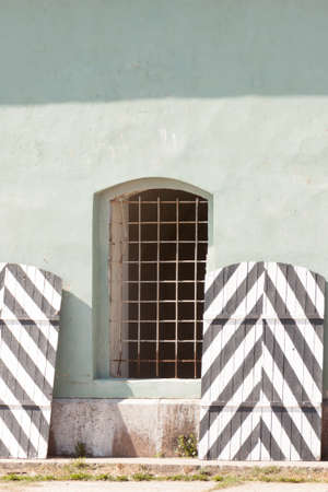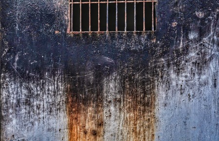 Rustic Blue Wall Window with Metal Bars Sunlight Texture Background old art aged grey iron dark