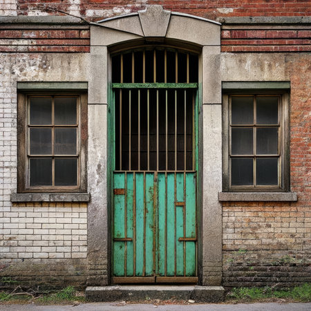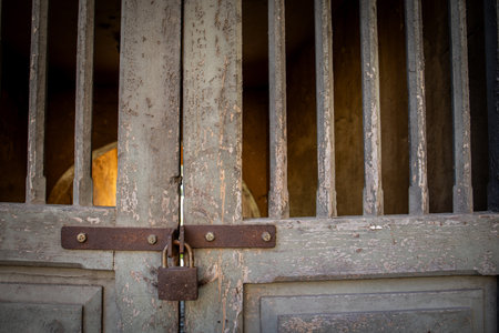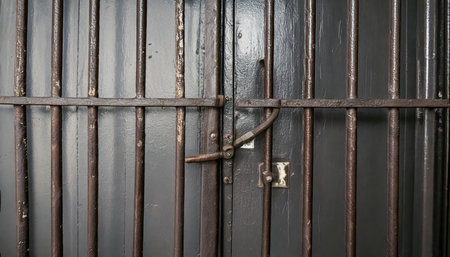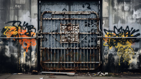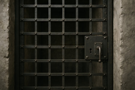 Sturdy prison gate with iron grate and keyhole on solid stone wall. concept of security, confinement, institutional structure.