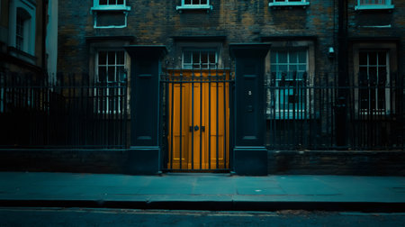 Yellow wooden door and black metal gate in front of a London house with dark bricks