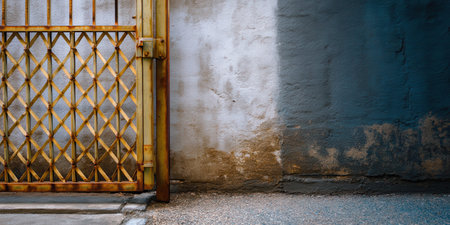 Rusty metal gate with diamond pattern beside weathered concrete wall showing dirt and shadow on street