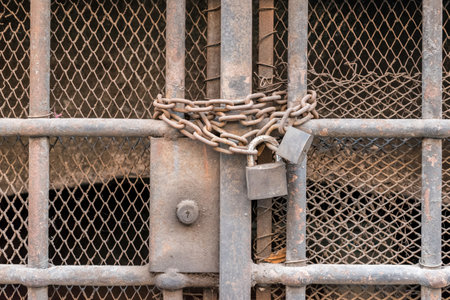Gates with mesh on lock in iron fence. Metal gate with grid is fortified with diagonal reinforcement. Background image of steel rough gate with lock on chain.