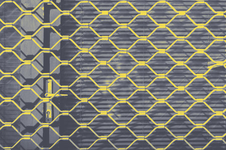 Iron texture of a steel grill on shutters on the door. Visualization trendy colors of year 2021 - Gray and Yellow