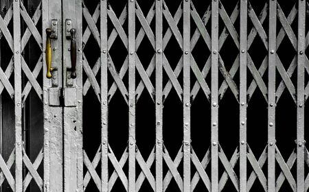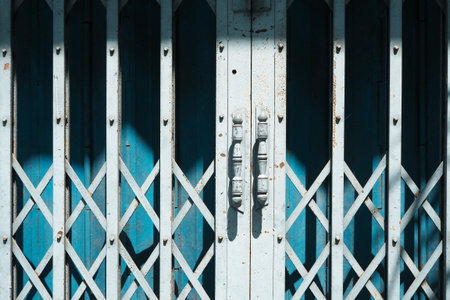 Morning sunlight and shadow on the closed metal steel door - Folding door texture pattern and background.Expanded metal sliding gate. Old style grunge metal door.