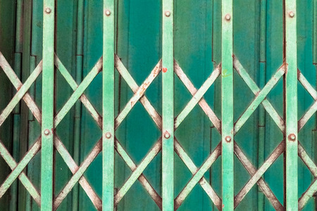 Folding old green metal door gate. Expanded metal sliding gate. Old style grunge metal door. Rustic expanded metal shutter door close with lock pad