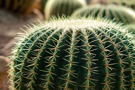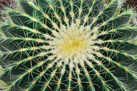Close up of golden barrel of Echinocactus grusonii. Exotic prickly plant close up. Top view.