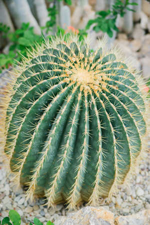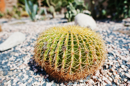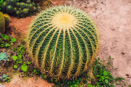 famous golden barrel cactus Echinocactus grusonii Hildm in the rock garden