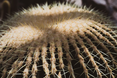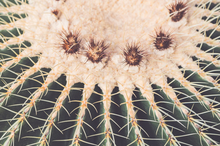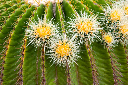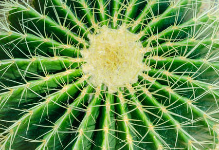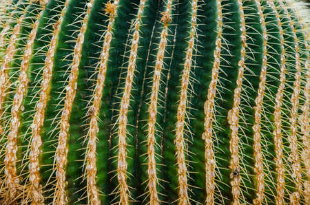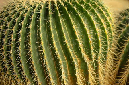 thorn cactus texture background, close up. Golden barrel cactus, golden ball or mother-in-laws cushion Echinocactus grusonii is a species of barrel cactus which is endemic to east-central Mexico