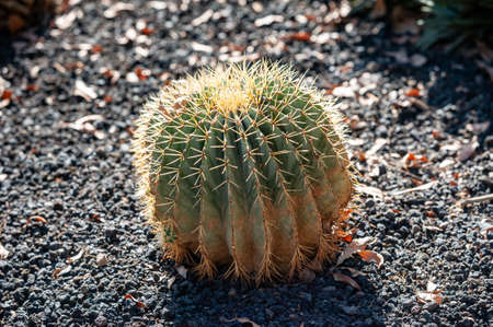 Large round cactus into rubble ground at sunny day