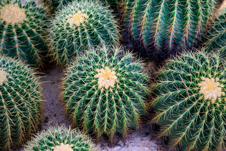 Large group of large cacti Echinocactus grusonii, Golden Barrel Cactus, Golden Ball Cactus