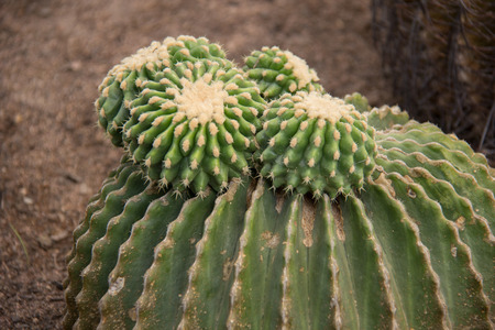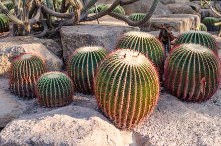 Cultivated cactus on desert land. Ferocactus echidne, barrel cactus, Sonora barrel, Coville's barrel cactus, Emory's barrel cactus, and traveler's friend. Tenerife, Canary Islands.