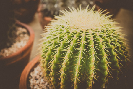 Macro photo of prickly cacti in small pots, homeplant