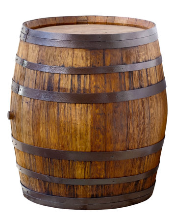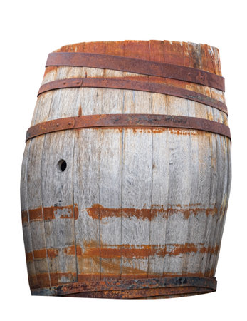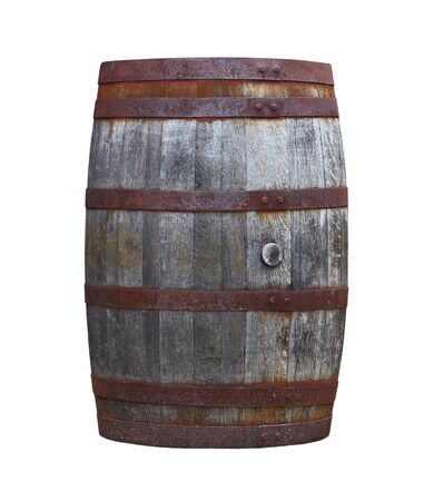 Old wooden oak barrel with iron rings isolated on white background. Beverage barrel.