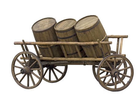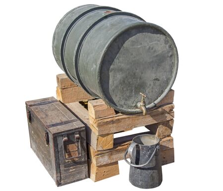 barrel oak old weathered rusty old iron hoop set wine-making white isolated background