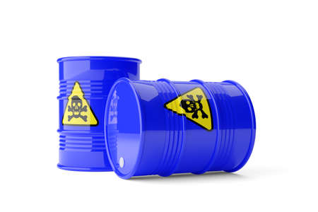 Two blue metal barrels with yellow hazardous or toxic skull and bones sign on white background, toxic pollution, industrial chemical waste or pollution concept, 3D illustration