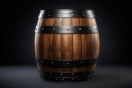 Old wooden whiskey barrel with metal strapping on black background. Copy Space.