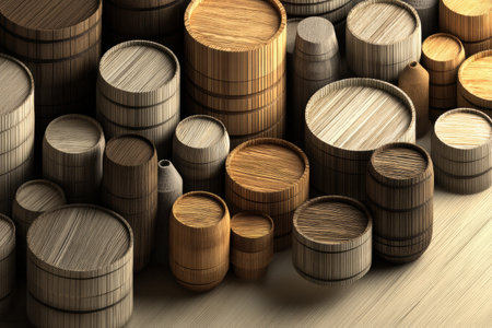 Wooden barrels arranged geometrically showcase unique shapes and colors against a neutral background for a modern look.
