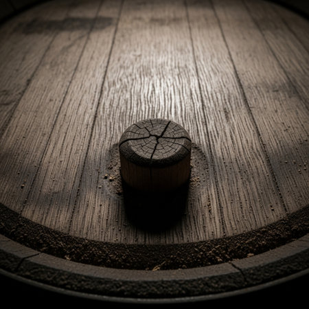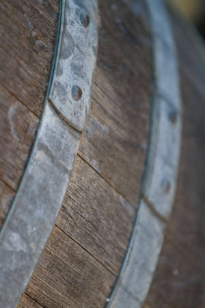 This close-up image showcases the intricate details of a wooden barrel, focusing on its metal bands and weathered texture, evoking a sense of craftsmanship.