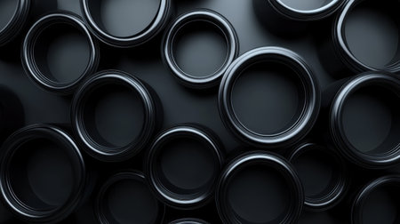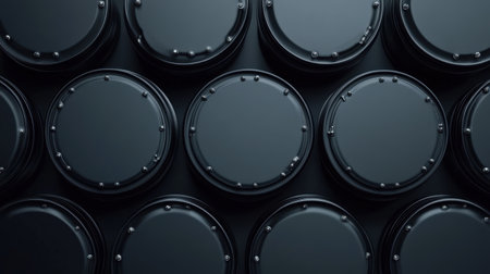 A visually striking arrangement of vintage black metal barrels, meticulously placed in a symmetrical layout. The close-up captures the intricate details and textures, creating a modern industrial aesthetic perfect for various creative projects.
