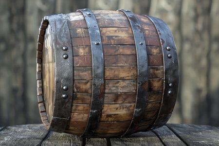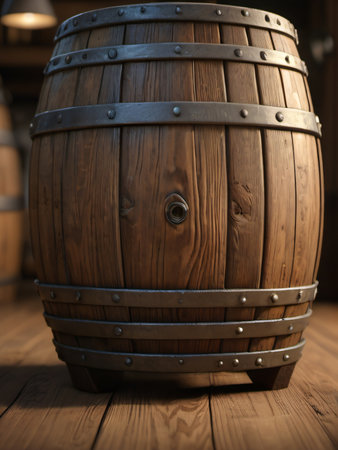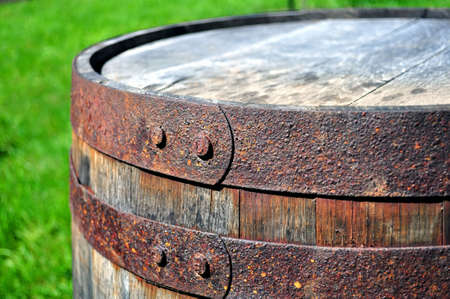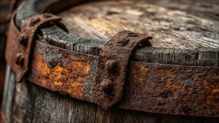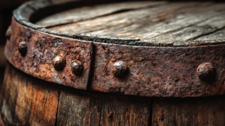 This close-up showcases a weathered wooden barrel featuring rusty metal bands. It highlights the textures and colors of aged wood and corrosion revealing a rustic atmosphere.