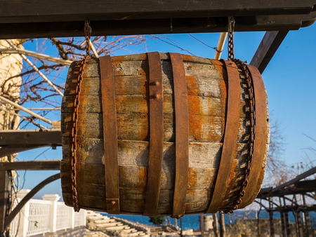 storage, container and object concept - close up of old wooden barrel with rusty hoops outdoors