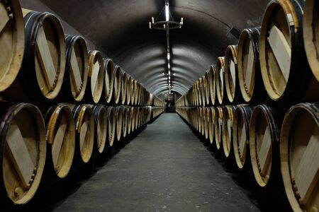 Whiskey, bourbon, scotch or wine barrels in an aging facility. Wooden wine barrels in perspective. Wine vaults. Vintage oak barrels of craft beer or brandy.
