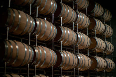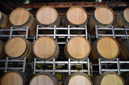 Front view of wine barrels in storage at a winery in the Adelaide Hills, South Australia