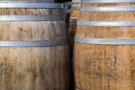 Wooden barrels in the old cellar in winery. barrels for wine with steel ring