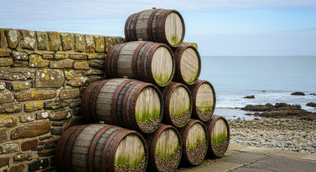 Several wooden barrels are stacked closely together in a distillery setting. The barrels, showing different finishes, highlight traditional craftsmanship used for aging beverages.