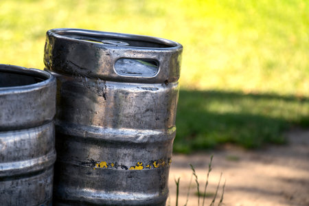 Dented metal kegs for foamy drinks standing outdoors, showing signs of use in beverage service industry.