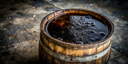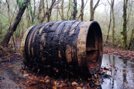 rainwater collected in the hollow of a worn barrel, created with generative ai