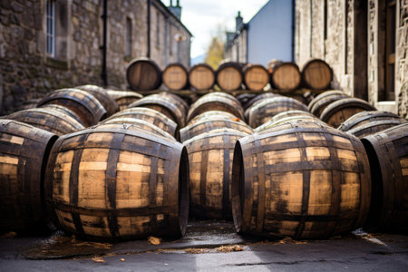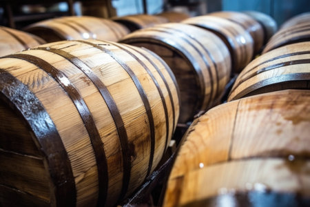 Several wooden barrels are stacked closely together in a distillery setting. The barrels, showing different finishes, highlight traditional craftsmanship used for aging beverages.