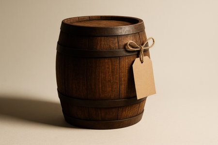 Wooden drum barrel in threequarter angle with a blank kraft paper hang label tied with natural twine near the top hoop studio isolated on white