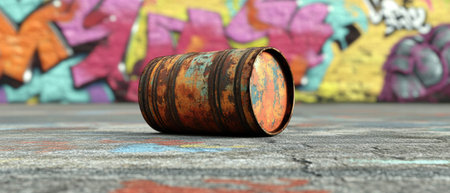 Rusty barrel abandoned in vibrant graffiti alley showcasing urban decay and artistry