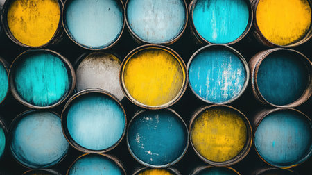 A stunning collection of colorful barrels stacked in an artistic formation, capturing the intricate details and vibrant colors against a rustic backdrop. Perfect for artistic projects.