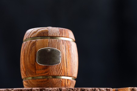 Closed wooden keg with honey on a wooden saw on a dark background. Barrel. Copy space. Close-up.