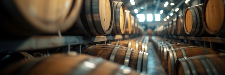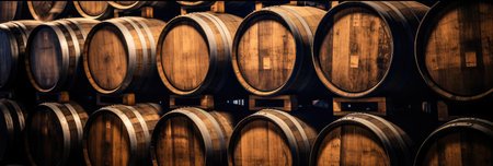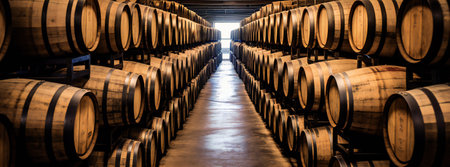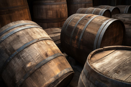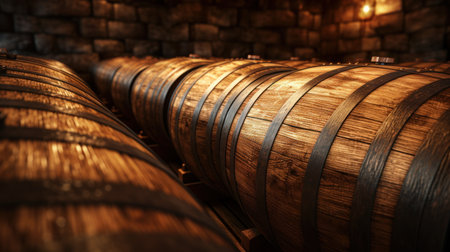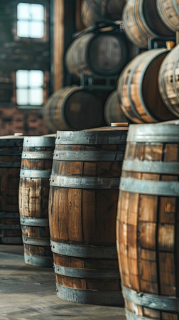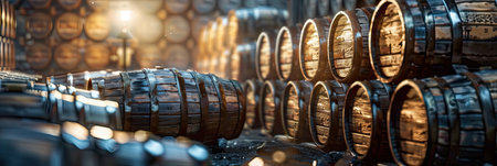 In a rustic warehouse, rows of old wooden whiskey and wine barrels are stacked closely, creating a warm and inviting atmosphere. The soft glow of light illuminates the barrels, highlighting their aged textures and craftsmanship. This setting evokes a sense of tradition and the rich history behind barrel aging.