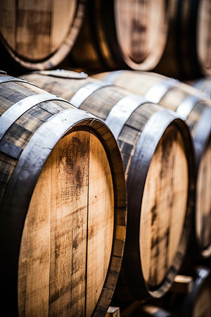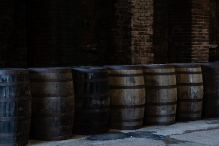 Whiskey, bourbon, scotch or wine barrels in an aging facility. Wooden wine barrels in perspective. Wine vaults. Vintage oak barrels of craft beer or brandy.