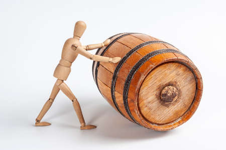 Wooden man rolls an old oak cask of wine closed by a cork. On a white background. Winemaking and logistics concepts.