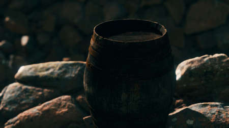 Vintage old oak barrels of wine, cognac in the wine dark vaults of the winery. Selective soft focus. Shooting in the dark