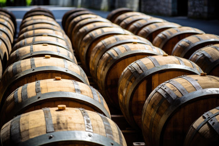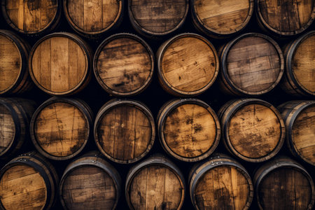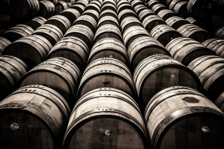 Stacked barrels in a winery warehouse, fermenting liquid in rows generated by artificial intelligence
