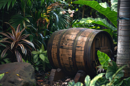 Old weathered whiskey barrel with metal hoops is resting in a lush tropical garden