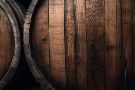 Vintage wooden barrels in old wine cellar close-up. Brown oak casks inside storage of winery. Concept of vineyard, viticulture, production, wood texture background, winemaking, whiskey. Generative AI.